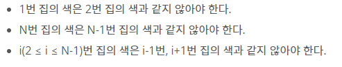 현재 칠할 집의 색은 앞에 칠해진 집의 색과 다르면 된다.