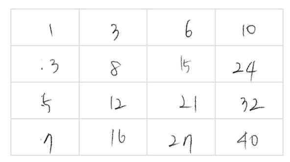 왼쪽 아래의 표를 중간과정을 반복해 구한 누적합이 오른쪽표의 값이다.