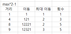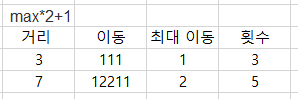 - 이동 횟수는 최대이동거리를 max라고 했을 때, max*2-1이거나 max*2이거나 max*2+1이다.