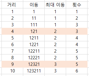 4의 거리를 이동해야 할 때 갈 수 있는 방법은 1111과 121, 112이지만 122는 2로 끝나므로 1111,121만 해당된다. 이중 최소 움직임은 121이다.