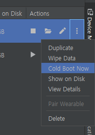 avd실행시키지 말고 바로 deviceManager 들어가서 해당 avd를 Clod boot Now 하면 해결된다.